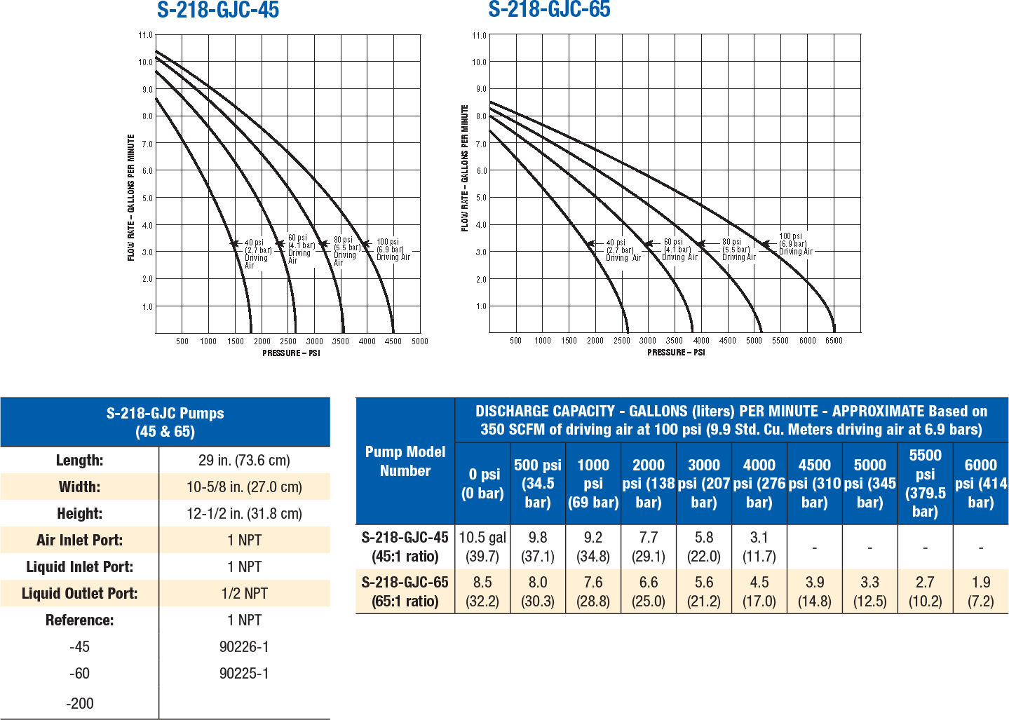 Offered in three pumping ratios (45:1, 65:1 and 200:1), the S-218 pump produces medium to high pressures for controlled flow or for holding pressures. By regulating the air supply, liquid outlet pressure can be infinitely adjusted throughout the pump’s pressure range.