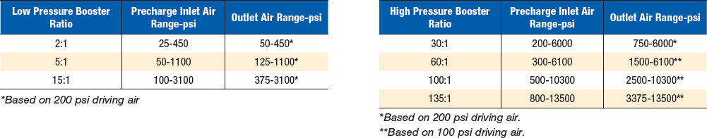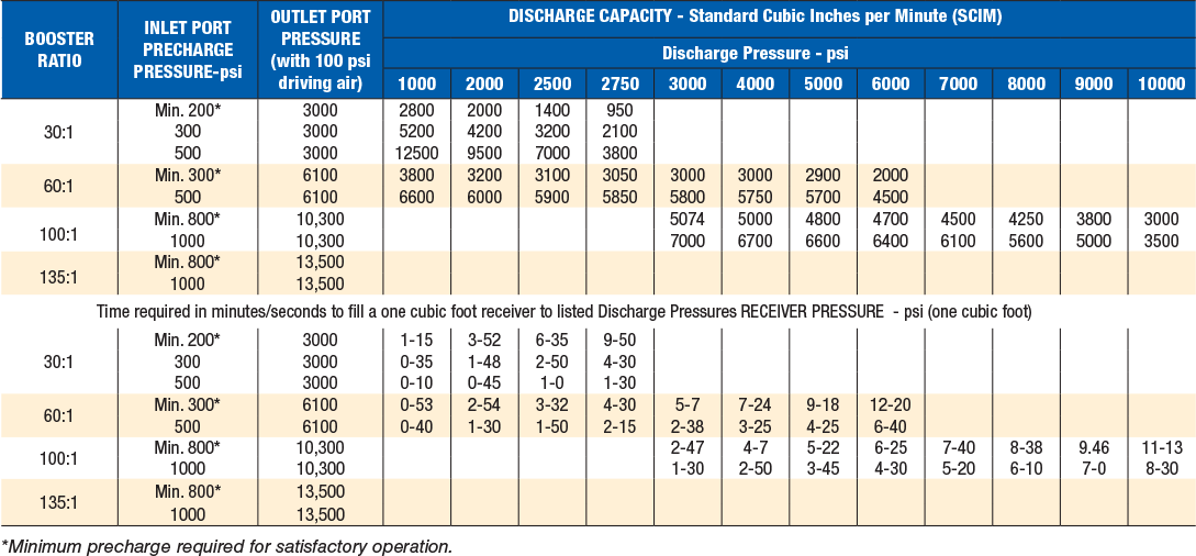 In general, an air or gas charging application requires a specific volume to be brought to a specific pressure within a given amount of time. The adjacent tables will assist you in selecting the most efficient ratio Sprague booster for your application requirements.