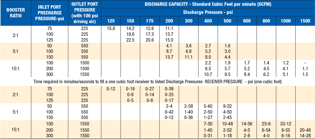 - Using Table 1, Low Pressure Gas Boosters Performance, page 46, find the required receiver pressure of 500 psi. Compare the figures found in the 500 psi discharge pressure column to the desired time of three minutes. The column figures nearest to three minutes is 2 minutes, 45 seconds with a discharge rate of 4.4 standard cubic feet per minute. So, the 5:1 ratio booster will do this job more efficiently than a 15:1 ratio booster.