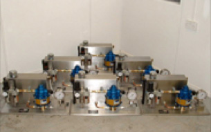 Wall mounted dual pump pressure test power unit for test cell operation to 30,000psi. Safety interlock feature to test cell doors incorporated. Pump skid supplied separately, located inside the test cell, all interfaced using appropriate tubing & hoses.