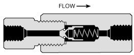 Soft seat check valves insure flow in one direction only and can be mounted in any position. These are highly reliable for both gas and liquid service. Standard O-ring (soft seat) material for the sealing surface is Buna-N (nitrile) with other materials including Teflon and Viton available on request. Temperature is limited by the choice of O-ring material. Material of all other parts is high tensile 316 stainless steel. Standard glands and sleeves are provided unless otherwise specified.