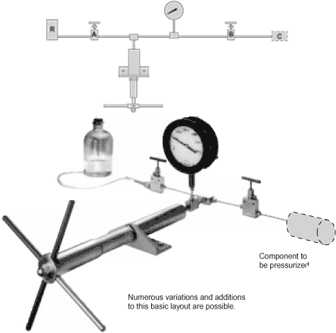 The schematic illustrates a very basic layout for using a Pressure Generator. A reservoir (R) is shown connected by means of valves and fittings to a component (C) that is to be pressurized. A gauge has been included for determining pressure.