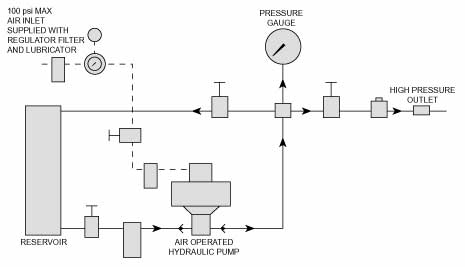Hydraulic input is gravity fed, however, if pump is used alone, the feed can be pressurized to the limit of the pump. Within the pump the large diameter air piston drives a smaller piston to provide fluid flow at high pressure.