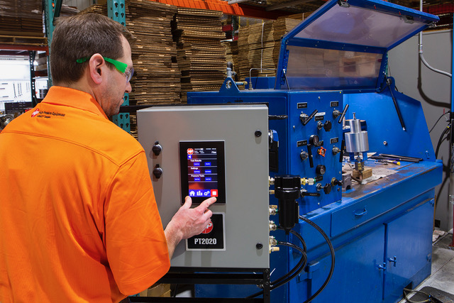 The new triple pump PT2020 controller addresses a need for hydrostatic test benches that utilize multiple pumps for specific functions. In order to maximize efficiency and prolong the service life of high-pressure hydraulic pumps, test benches often run two or three pumps to conduct their testing. For example, Pump 1 is a low-pressure pump used to fill the item being tested, Pump 2 is a medium-pressure pump that drives the pressure to a specific setting, and Pump 3 is a high-pressure pump that delivers final test pressure. The PT2020 controller allows an operator to program a test using all three pumps and walk away. The controller will run the test and provide a pass/fail report.