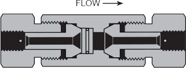 Soft seat check valves insure flow in one direction only and can be mounted in any position. These are highly reliable for both gas and liquid service. Standard material for the sealing surface (soft seat) is Buna-N (nitrile) on 1/4", 3/8" and 9/16" models, and Teflon on 3/4" and 1" models, with other materials (including each of these, as well as Viton) available upon request. Temperature is limited by the choice of O-ring material. Material of all other parts is high tensile 316 stainless steel. Standard glands and collars are provided unless otherwise specified.